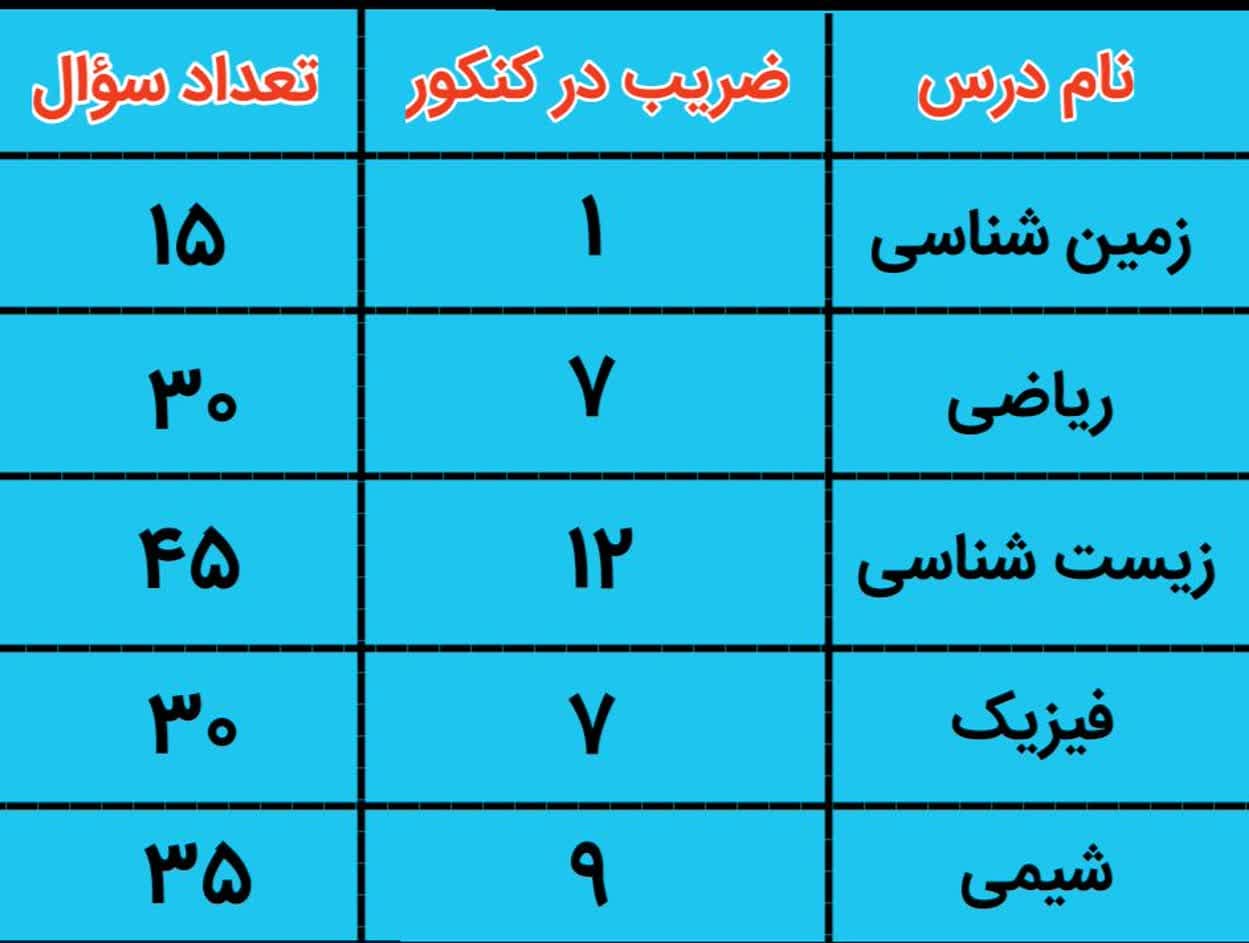 ضریب درس های کنکور تجربی 1405 :